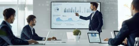 Ein Manager präsentiert Unternehmensdaten mit Diagrammen und Grafiken in einem Meeting.